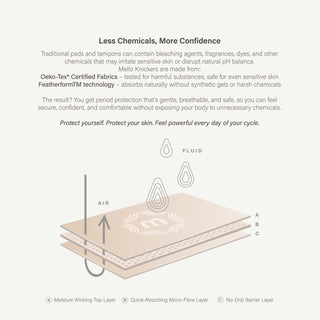 Crafted with our FeatherForm™ 3-layer absorbent system, Mello holds up to 15 tampons’ worth of flow while feeling light, breathable and effortless on the body.